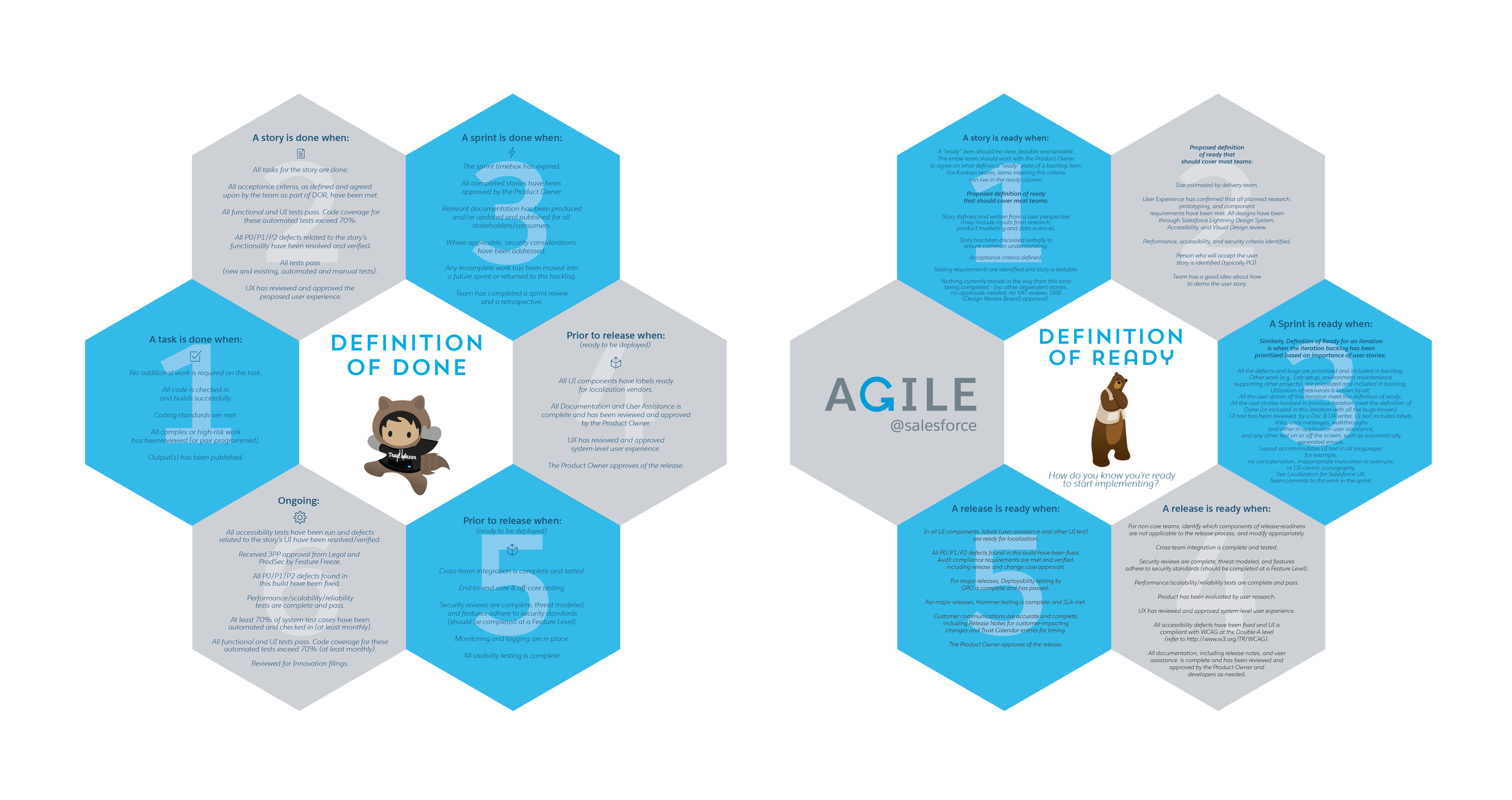 An interactive, fold out pamphlet describing the two definitions of Agile in a honeycomb pattern.